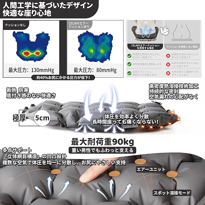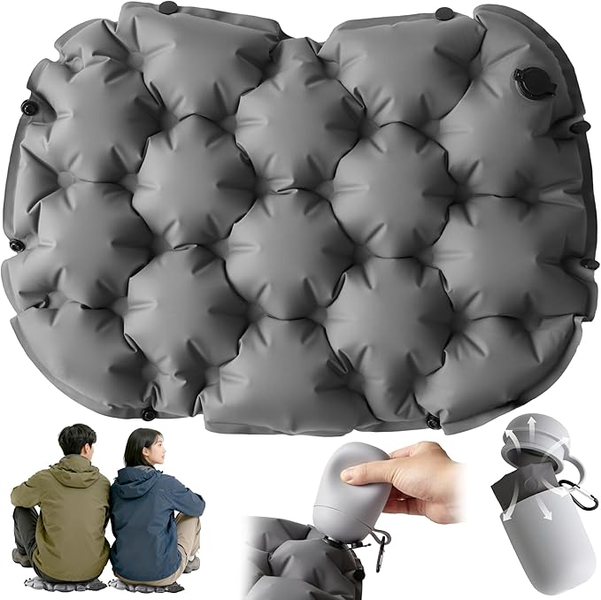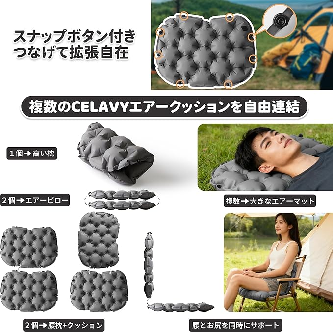CELAVY エアークッション 飛行機 快適グッズ 夜行バス 折りたたみ座布団 3D 体圧分散 お尻が痛くならない 折り畳み ポータブル エアクッション ポケット 携帯 軽量 コンパクト エアーマット 一人用 厚手 レジャーシート 持ち運び 便利 インフレータブルクッション 収納ケースが空気ポンプ付き 連結可能 キャンプ 釣り 登山 花見 野球 スポーツ観戦 アウトドア グレー