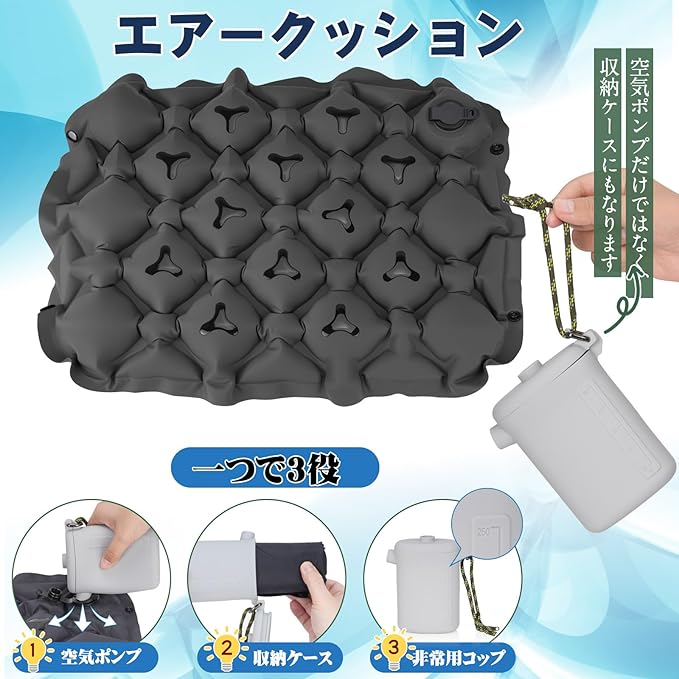 【ポンプ付き&1つで3役】エアクッションはポンプが付いています。収納できるだけでなく、自体で3~5秒間空気を吹き込むだけで即座に膨らみます。余計な空気入れ道具が不要で、必要に応じて非常用コップとしてもご利用いただけます