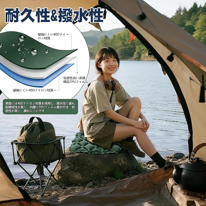 【優れた耐久性と撥水性】表面には40Dナイロン材質を採用し、撥水性に優れ、耐摩耗性が高く、内層にTPUフィルム層が付き、気密性が高く、漏れにくいです。超軽量ながら最大100kgの荷重能力を持ち、アウトドアキャンプにおすすめます