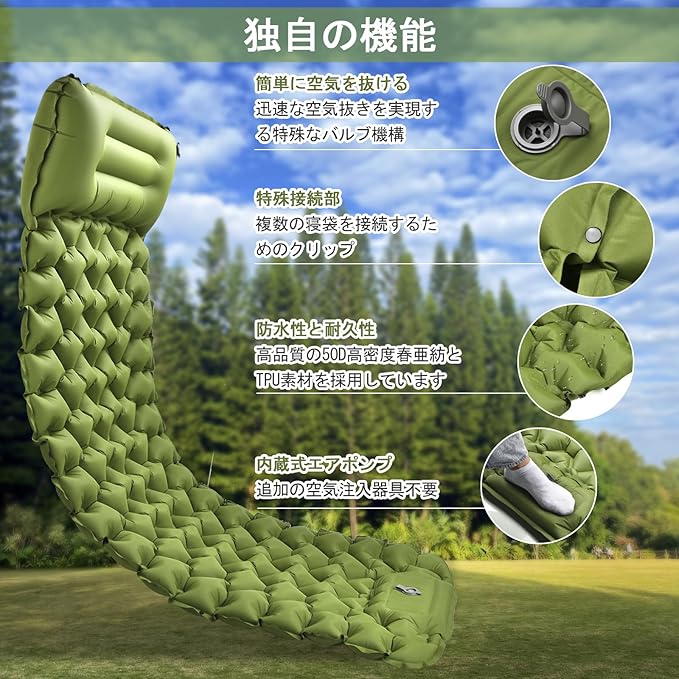 【柔軟な連結・強力な耐荷重】エアマット両側に接続ボタンを装備し、複数マットのシームレスな連結を簡単実現。様々なシーンのニーズに対応します。専用収納袋付属で省スペース・携帯性に優れています。最大耐荷重200kg。家族旅行でも友人との集まりでも、安心して自由にアウトドアの楽しい時間を共有できます。