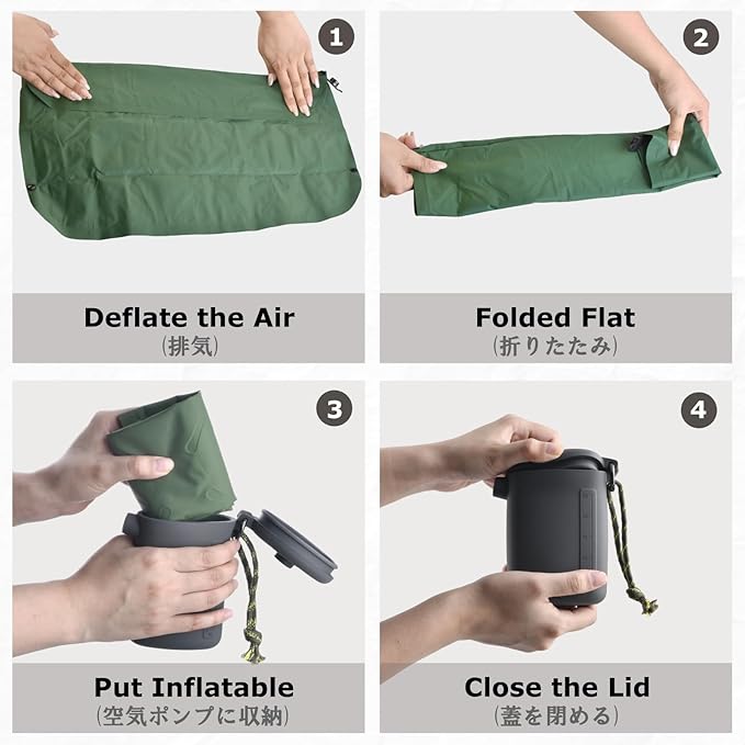 ✅【素早く膨らむ・簡単排気】食品級シリコン製の空気ポンプを使い、数回操作するだけで素早くふっくら膨らみ、即座に使用可能。専用バルブを開けば一気に空気が抜け、撤収もストレスなし。力の弱い方でも簡単に扱えます。