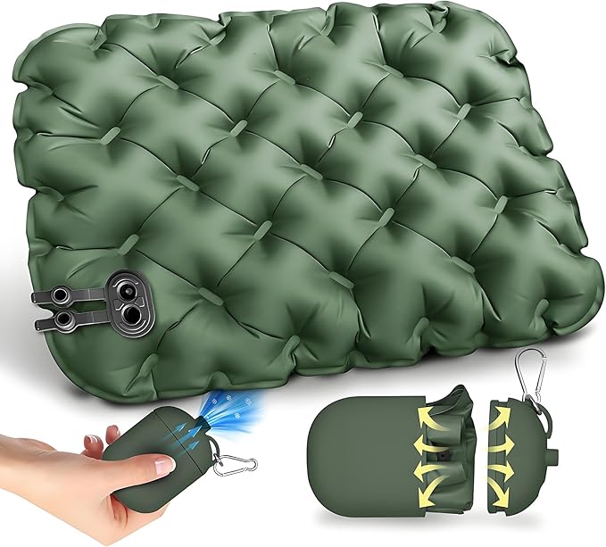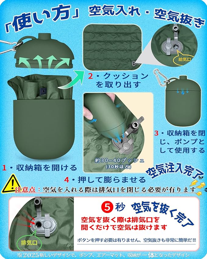 ✅【1つで2役&エアーバルフ徹底改良】従来のエアー座布団とは異なります。LolyyDensのエアマットシリコン収納ボックスは、エアクッションを収納できるだけでなく、シリコンボックス自体がエアポンプになります、余計な空気入れ道具が不要、。エアポンプを手で約30回押すだけで、素早く空気が充満する。キャンプ 座布団は2つのエアバルブにアップグレード。左侧から空気を入れ、右侧は排気孔で、空気を入れる時は、右の排気孔を閉じて、ポンプで空気を入れます。排気時には、右側の排気バルブを開けるだけで簡単に空気を抜くことができます。