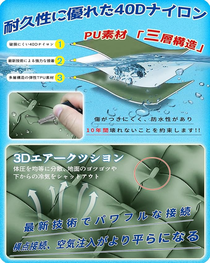 ✅【上質な生地&いつでも清潔】折りたたみマットエアー座布団は40Dのナイロンと三層構造のTPU素材を採用、超軽量なのに、高弾力と耐消耗性が強く、耐久性に優れているなどの特性を持っているため、アウトドアに最もおすすめのキャンプ用品です。水や汚れにも強い、生地は耐水加工を施しており、汚れがついた場合は、汚れた場合は濡れタオルで簡単に拭き取ることができ。突然の雨も怖く無い、屋内外での使用も可能にしました!
