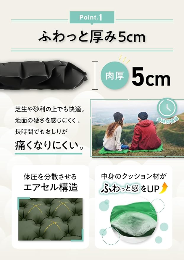 【空気を入れるだけで快適な座り心地】座面をしっかり支え、地面の硬さや冷たさを感じにくく長時間でも快適。
