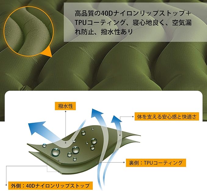 【高品質の材質】高品質&超軽量40Dリップストップナイロンの生地を採用し、裏側がTPUコーティングであり、防水性・防湿性・防寒性・耐摩耗性に優れます。