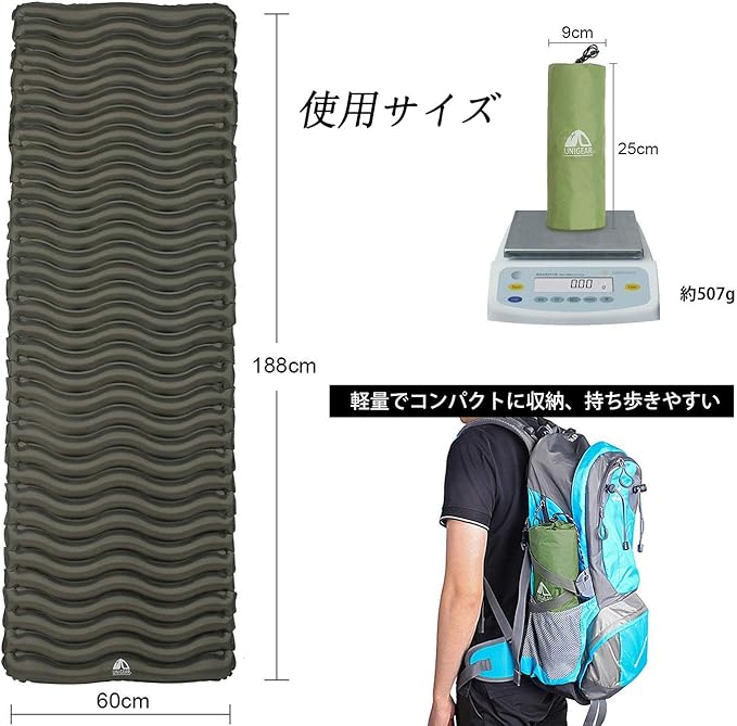 【製品仕様】サイズ&重量:膨張後サイズ188cm 60cm 5cm、収納サイズは25cm 9cm;重さ:約510g;耐荷重:200kg;4x補修シート;収納袋付き。【半年保証付】製品が届いてから半年までの安心保証を提供いたします。ご使用中に不具合の場合がありましたら、いつでもお気軽に弊店をご連絡ください、返金または交換のサービスを対応をさせていただきます。