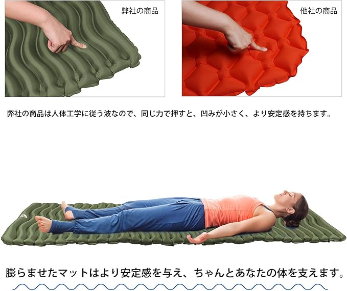 【様々なシーンで活躍】芝地、床、寝袋、車中、テント用のベッドとして大活躍しているエアーマットですので、キャンプ、テント暮らし、車中泊、登山、花見などのアウトドアシーンにも、庭遊び、昼寝、座談会、親子活動などにも適用します。いざの時に、防災グッズとしてもご利用いただけます。