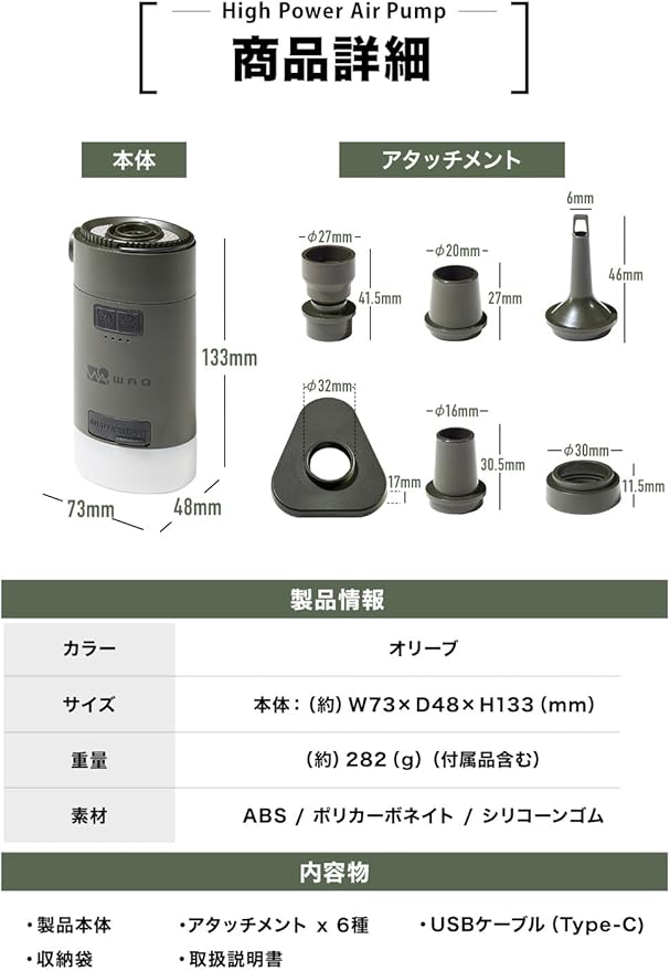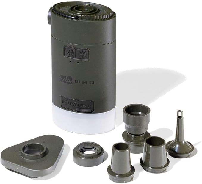 WAQ High Power Air Pump 電動ポンプ エアポンプ 電動 空気入れ アウトドア マット エアマット 圧縮袋 浮き輪 空気抜き LEDランタン USB 小型 大容量バッテリー 充電式 6種類のノズル付き | KAZESHOP