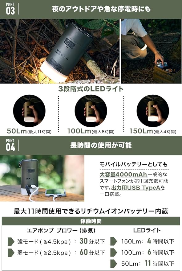 【3段階式のLEDライト / モバイルバッテリー機能】夜のアウトドアや急な停電時にも3段階式のLEDライト機能や、大容量4000mAhモバイルバッテリー機能を搭載。一般的なスマートフォンが約1回充電可能です。