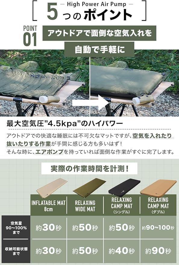 【最大空気圧”4.5kpa”のハイパワー】- アウトドアでの快適な睡眠には不可欠なマットですが、空気を入れたり抜いたりする作業が手間に感じる方も多いはず!そんな時に、High Power AirPumpを持っていれば面倒な作業がすぐに完了します。作業実測値を公開中!