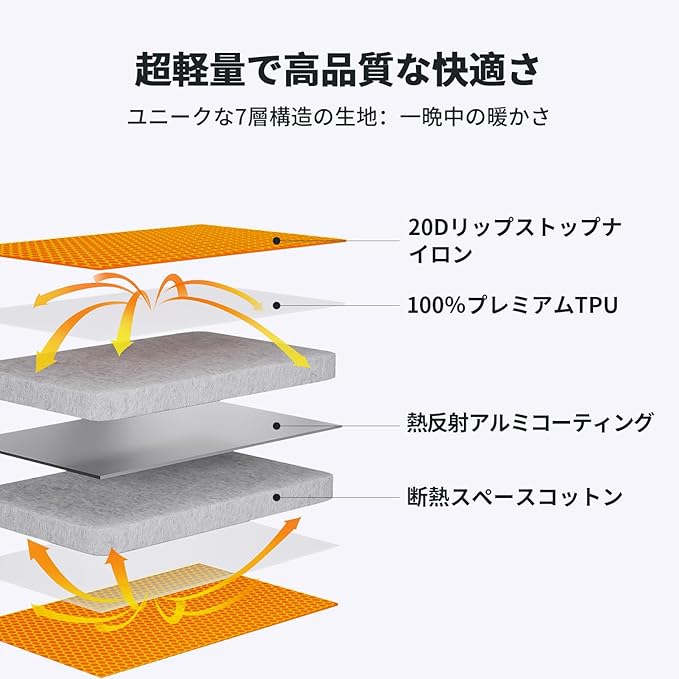 【非常に耐久性が高い】上部と下部はどちらも 20D リップストップナイロン素材で作られており、長期間の冒険による摩耗に耐えます。各スリーピングパッドは、お客様にお届けする前に、FLEXTAILGEAR の専門研究所で品質テストを受け、漏れがないことを確認します。