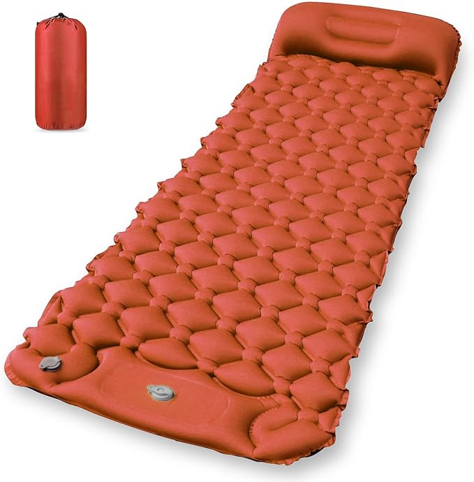 エアーマット 足踏み式 軽量 厚手 防水防潮 枕付き ブルー 厚さ約10cm 車中泊 マット キャンプマット 山登り キャンプ 収納ケース キャンプ用品 アウトドア (オレンジ) | KAZESHOP