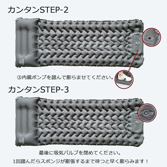 足踏み式で空気入れ不要 別売りポンプ・電気ポンプの購入、口で空気を入れる作業は必要なし。足踏み式エアーマットは従来の手押し式のエアーマットと違って、枕側ではなく足元側にエアポンプを内蔵し、足踏み式は足で踏むだけで約1分間ほど踏むことで、簡単に空気入れ完成できます。女性や子供、お年寄りに優しいです。