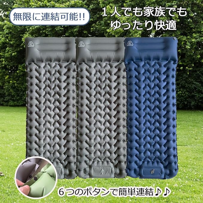 無限に連結OK! 無限連結可能エアーマットは両サイドに連結用のボタンがあり、ボタンをとめるだけ、隙間なく無限に連結できます。シングルエアーマットは一瞬でダブル用のエアーマットへ変身、また複数のマットを連結すれば、大人数も対応可能です。ご家族やお友達と一緒に楽しんでいただけます。