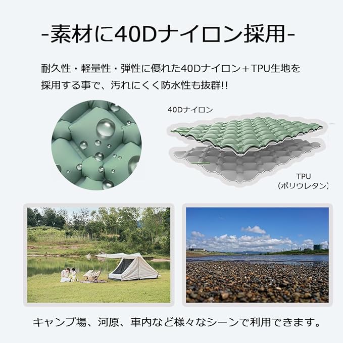 防水性に優れた設計 破損しにくい40Dナイロン素材+多層構造の防水加工で耐久性に優れたTPU素材を採用され、40DナイロンとTPU弾性複合布を使用しているので、高い強度と防水性を誇ります。アウトドア用マット、キャンプ用マット、テント用マットなど様々な用途に。キャンプや登山、車内泊、オフィスでの宿泊などにお使いいただけます。また、地震や災害時の防災用品としてもおすすめです。