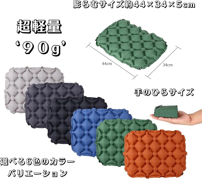 【軽量&超コンパクト収納】 わずか約90gの軽量クッション。使用時サイズは約44 34 5cmでしっかり厚みもあり快適。空気を抜けば、約10 9 3cmの手のひらサイズに折りたため、収納袋付きで持ち運びに最適!