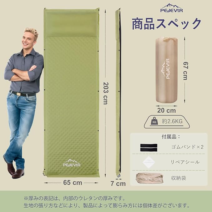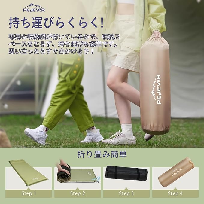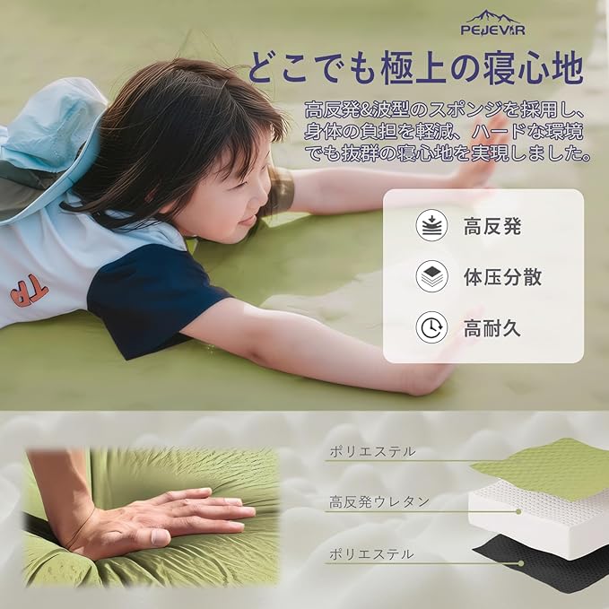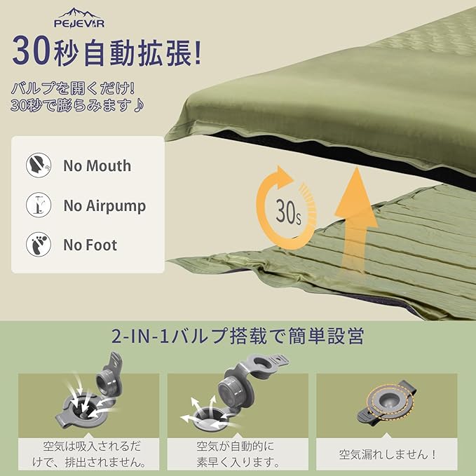⏱️【30秒自動拡張】2-in-1バルブ搭載で、バルブを開くだけで自動で空気が入り、わずか30秒で自動充気完了!気漏れを心配することなく、誰でも簡単に使えます。(※初回使用時はウレタン全体に空気が行き渡らず自動で7cmまで膨らまないことがあります。半分くらい空気が入った状態で三つ折りにして上に乗るように空気を抜いて頂くとウレタン全体に空気が馴染みます。また、マットの厚みは気温や保管状態によって変化します。)