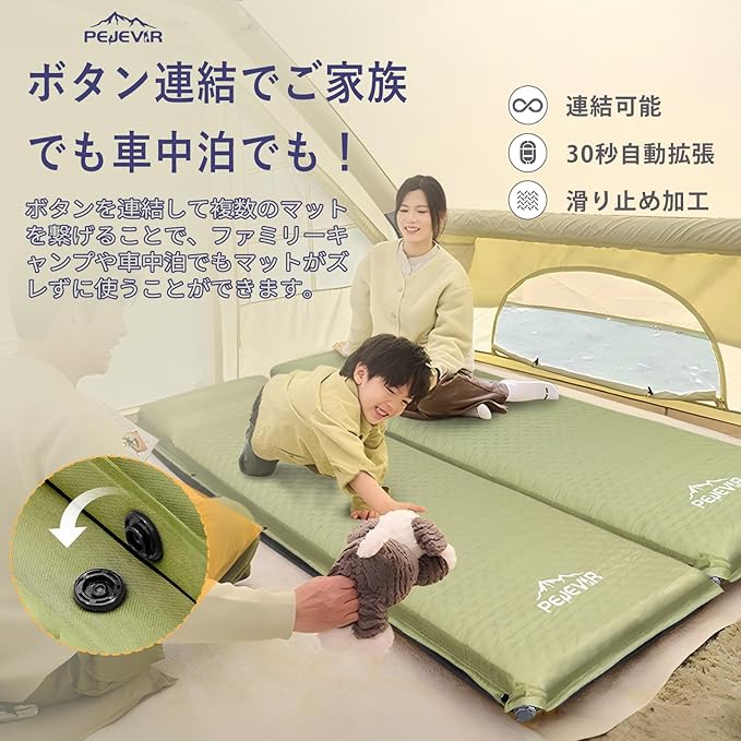 【連結可能・広範な適用性】マット両サイドに連結用のボタンがあり、2枚以上繋げられます。複数のマットを連結することで、横幅を広げられ、ファミリーキャンプや車中泊に最適です。