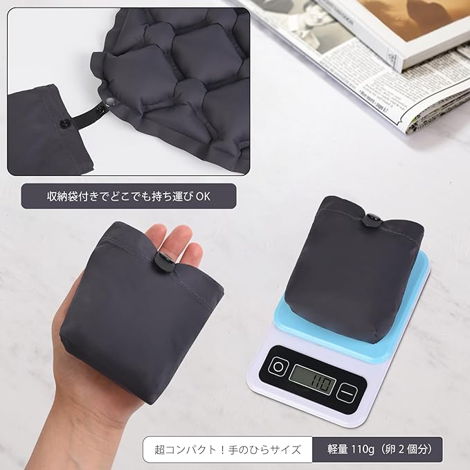 【超軽量110g&手のひらサイズ】 超軽量110gと手のひらサイズ収納(専用収納袋付属)。旅行用最適なコンパクトクッションとして登山、釣り、コンサートへ持ち運び可能。付属収納袋に入れて鞄にスッキリ収納、型崩れ防止。屋外イベントに最適。