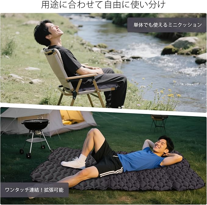 【1人用から家族用まで対応】 旅行 便利グッズの連結機能でエアーマット拡張。1人用から家族用レジャーシートまで柔軟対応。キャンプ用マットレスとしての省スペース設計。