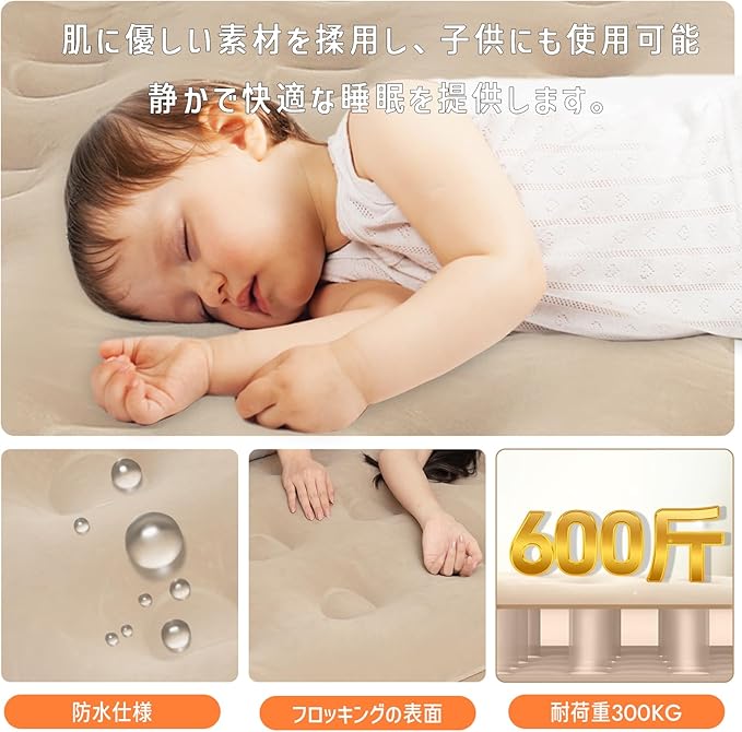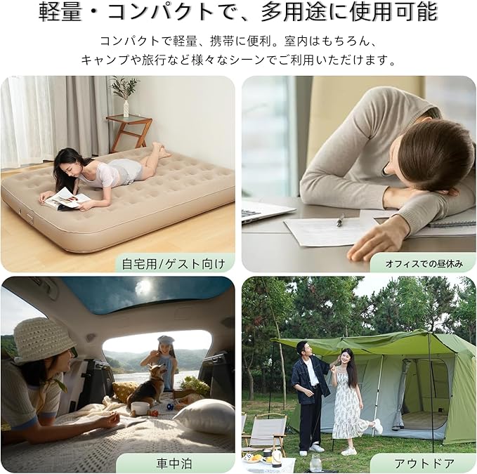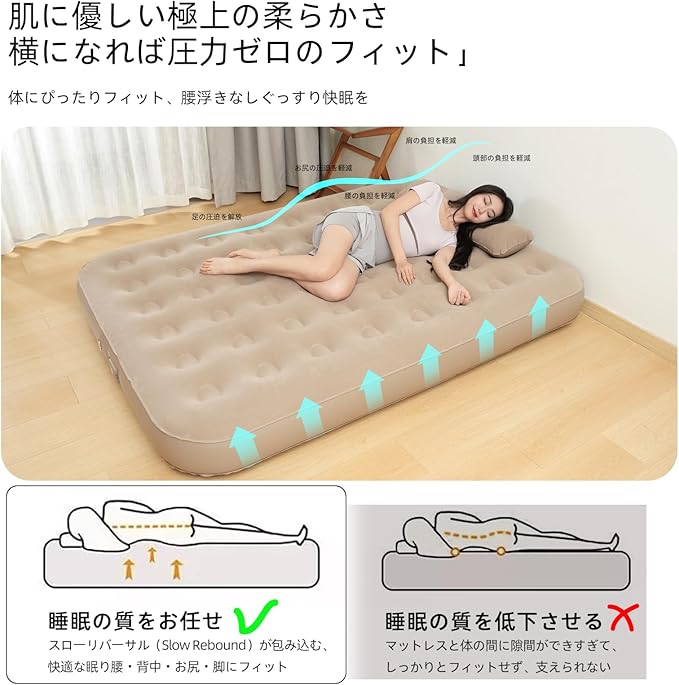 【人間工学に基づいた極上の快適性】 エアマットレスは、ハニカム構造を採用し、複数のポイントでしっかりと支えるため、安定性が高く、体圧を分散し、耐荷重は約300kgです。人間工学に基づいて設計され、体の自然なカーブにぴったりフィットします。マットレスには快適な枕も付属しており、どんな環境でも質の高い睡眠をお楽しみいただけます。