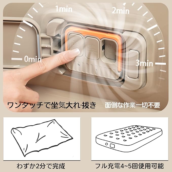 【内蔵高性能電動ポンプ・簡単操作】 このエアマットは内蔵の電動ポンプを搭載しており、ボタン一つで空気の排出と充填ができます。お好みに合わせてエアマットの硬さを調整することが可能です。電動ポンプは取り外して単独で使用することもでき、3種類の異なるノズルが付属しており、他の用途にも対応します。内蔵されたType-C充電ポートにより、充電中は赤いランプが点灯し、充電が完了すると緑のランプが点灯します。
