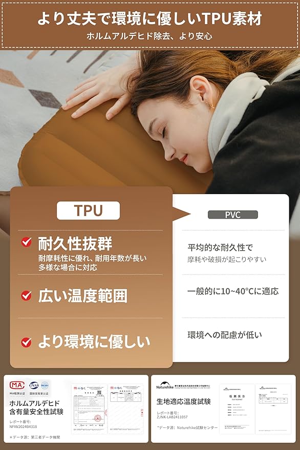 【心強い商品保証】このNaturehikeのマットにはお買上げ日から365日の保証を設けております。もし、問題があった場合はお手数おかけしますが、注文番号を添えてアマゾンの購入履歴より弊社までご連絡ください。ご連絡の方法:アカウントサービス内の「アカウントサービス」→「注文履歴」→「販売元」→「質問する」から、お気軽にお問い合わせください。※鋭利なものでエアクッションを傷つけないようにしてください。 ご使用の際は熱膨張・熱収縮にご注意ください。高温になると空気が過膨張、状態によって空気を抜いてください