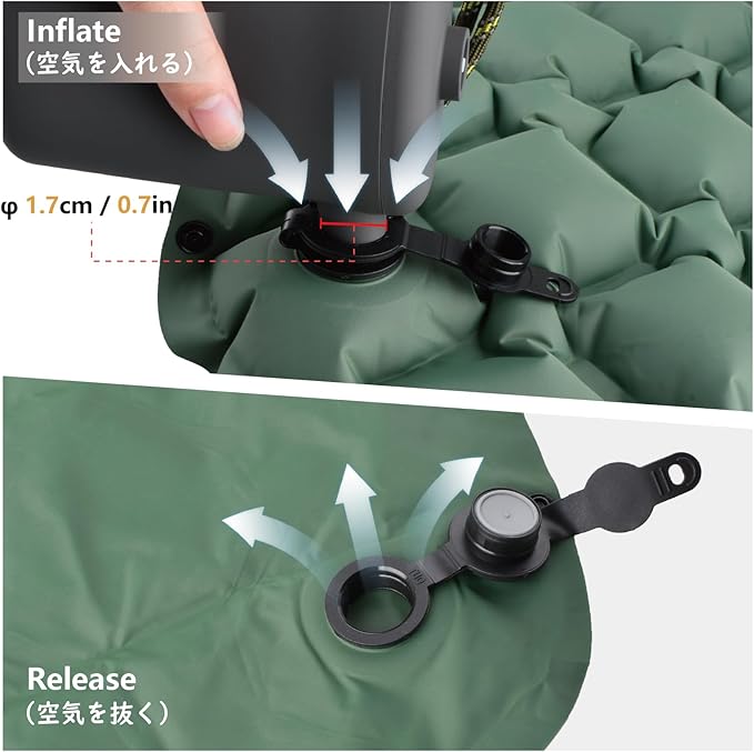 ✅【素早く膨らみ・操作簡単】-- レジャーマットの吸気口とエアポンプの注入口を合わせ、ポンプを数回押すだけでふんわり膨らみ、すぐに使用可能です。中央の排気バルブを押すだけで素早く空気が抜け、最後のキャップを開ければ完全に排気でき、収納もラクラク。力の弱い方でも簡単に扱えます。