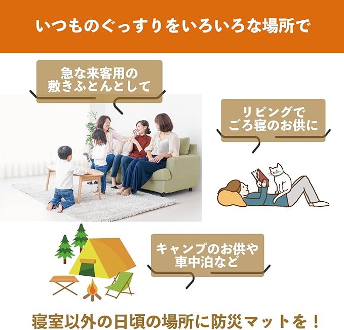 ◆リビングでのごろ寝や、キャンプでの車中泊、急な来客の敷きふとんとしても使えます。もしもの備え以外にもあると便利なマットです。