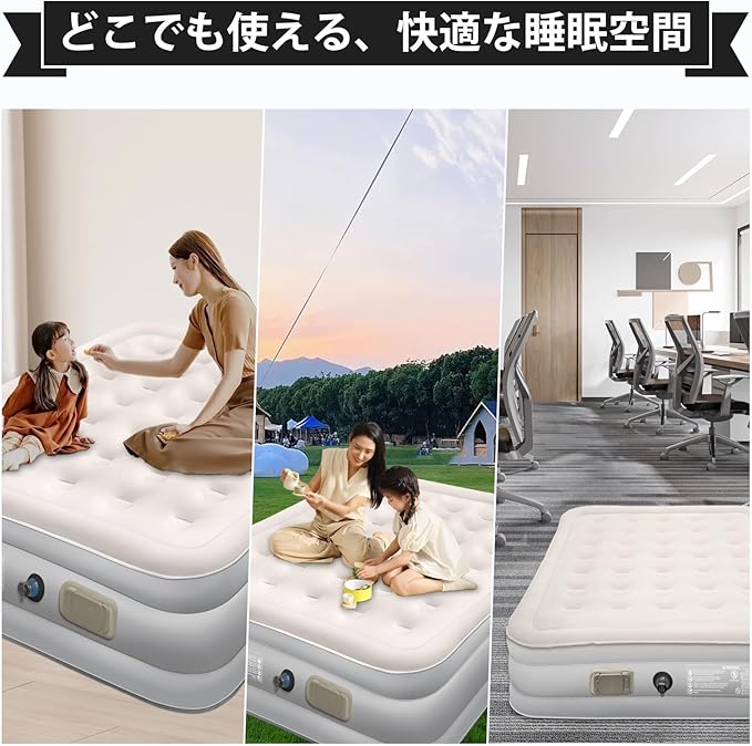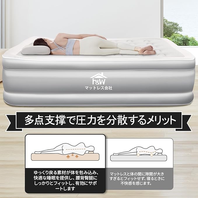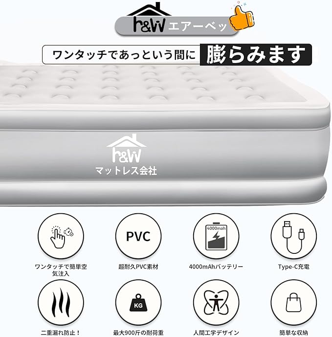【耐久性抜群!最新技術のエアーベッド セミダブル✨】 H&W*家庭用品会社が、お客様の声をもとに改良したエアーマットレスは、耐久性と快適性を極限まで引き上げました!0.60mm厚のPVC素材はまるで鉄の盾のように、900斤もの重さに耐えられるほど頑丈です 。内蔵電動ポンプはわずか3~5分で風船のように膨らみ、一瞬で快適な寝床が出来上がります !さらに、折りたたむと魔法のようにコンパクトに収納できるので、スペースを全く取りません✨。
