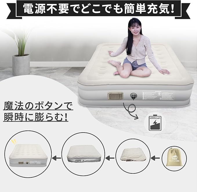 【超高速充気ポンプで、どこでも瞬時に膨らむ ️】 H&Wのエアーマットレスは、4000mAhの強力バッテリーを搭載した内蔵電動ポンプで、まるでジェット機のエンジンのように5分以内で膨らみます !ボタンひとつで、魔法のように空気が注入され、硬さもお好みに合わせて自由自在に調整可能 。夜空の下でも電源の心配なしにどこでも使用でき、まるで大自然が自分だけの寝室に早変わりします 。電源やコンセントに縛られることなく、自由にアウトドアを楽しめます 。