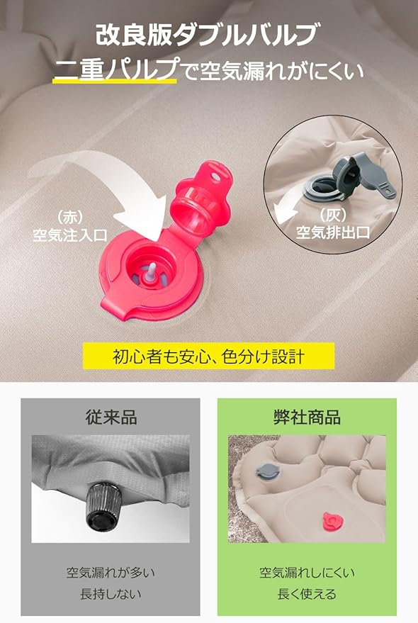 【初心者にも優しい・耐重設計】充気口と排気口は色で区別されており、赤は充気口、灰は排気口と一目でわかります。初心者でも簡単に使用可能です。熱接合技術によるエッジ加工で耐久性が向上しており、複数人が使用しても耐えられる設計です。最大耐荷重は200kgで、家族や友人と一緒に使っても安心してアウトドアを楽しめます。