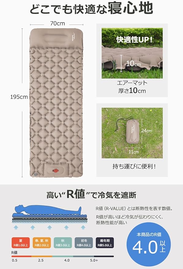 エアーマット キャンプ 足踏み式 【2025新開発&25秒膨らむ】 車中泊マット 枕が付き アウトドア 防災 寝袋 R値4.0 厚手 防水防潮 災害用 軽量 持ち運び便利 簡単収納 収納袋付き 日本語取扱説明書 | KAZESHOP