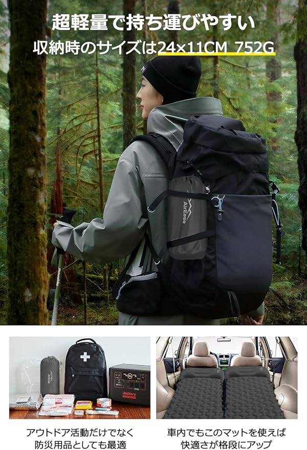 【携帯に便利・あらゆるシーンで大活躍】重さはわずか約752g、折り畳み後のサイズは24*11cmとコンパクト。バックパックにすっきり収まり、持ち運びも楽々です。キャンプ、登山、車中泊、災害時の備えとしても最適で、どこへでも気軽に持って行けます。いつでもどこでも最高の睡眠環境を提供します。