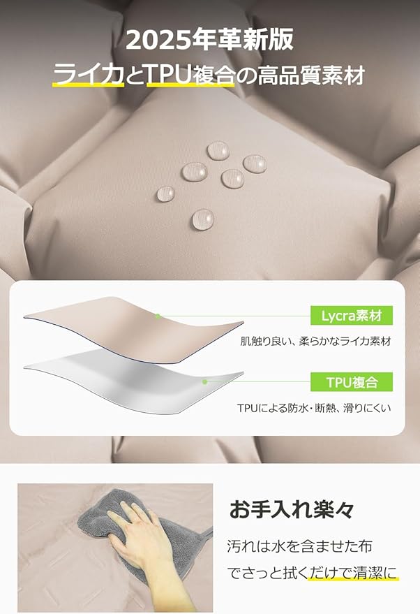 【耐久性&快適性を兼ね備えたデザイン】ナイロンよりも柔らかいライカ布地を使用し、TPUの防水防湿コーティングが施されています。これにより、耐摩耗性が高く、裂けにくくなっています。突然の雨でも安心、表面をサッと拭くだけで清潔を保てます。いつでもどこでも清潔で快適な睡眠を提供。キャンプや登山、車中泊や緊急時の避難所でも、このエアーマットがあれば安心です。