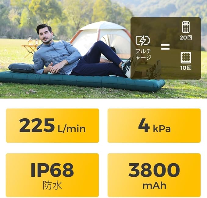 【内蔵電動エアポンプ設計 - 簡単な膨張を実現】Aerogogoエアーマット内蔵の電動エアポンプが付いており、フットポンプ、口での膨らませ、手動のポンプは不要で、わずか60秒で膨らませと設置が完了します。 3800mAhの大容量リチウムイオンバッテリーを搭載し、エアマットレスを20回以上完全に膨らませることができます。 225L/minの風速を持ち、より多くの空気を放出し、迅速な膨らませを確保します。 内蔵の高圧エアポンプは、最大4kPaに達します。 十分な硬さがあり、崩れることはありません。 ワンタッチで簡単に起動します。