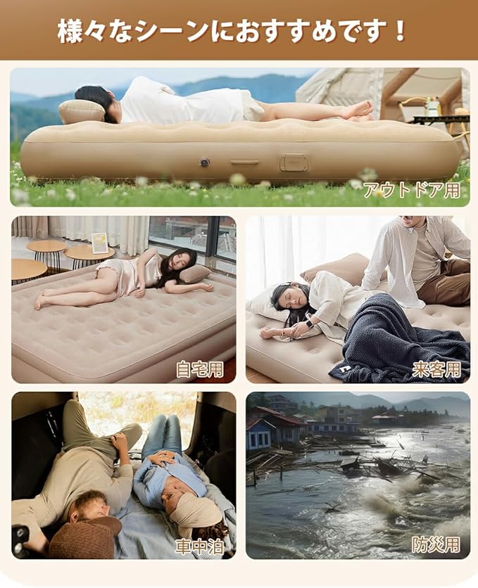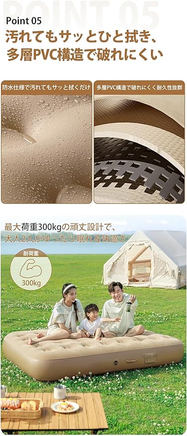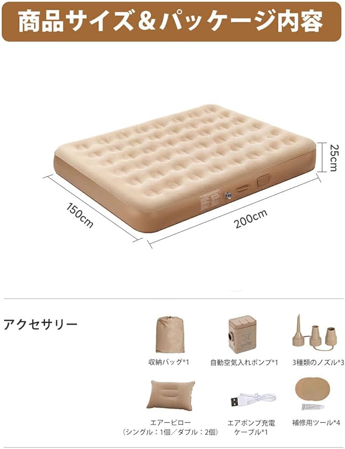 【3種類口付きの電動ポンプ内蔵】エアーベッドは、内蔵の電動ポンプによって自動で膨らみ、僅か2~3分でベッドが完成します。その上、他社と異なり、エアクッション枕など他のキャンプ用品にも使用することができます。さまざまな製品に対応できる3サイズの口を用意しています。 修理シール付属、万が一エアーベッドが破損した場合でも迅速に修理が可能です。