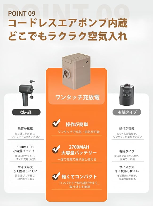 【多機能電動エアポンプ】コードレスタイプのポンプで、2700mAh大容量バッテリー内蔵。1回の充電で約4~6回の使用が可能です。コンセントのないアウトドアや車中泊でもラクラク使用OK!Type-C充電対応。モバイルバッテリーでも充電できるので、キャンプや車中泊、停電時など“もしもの時”にも大活躍!