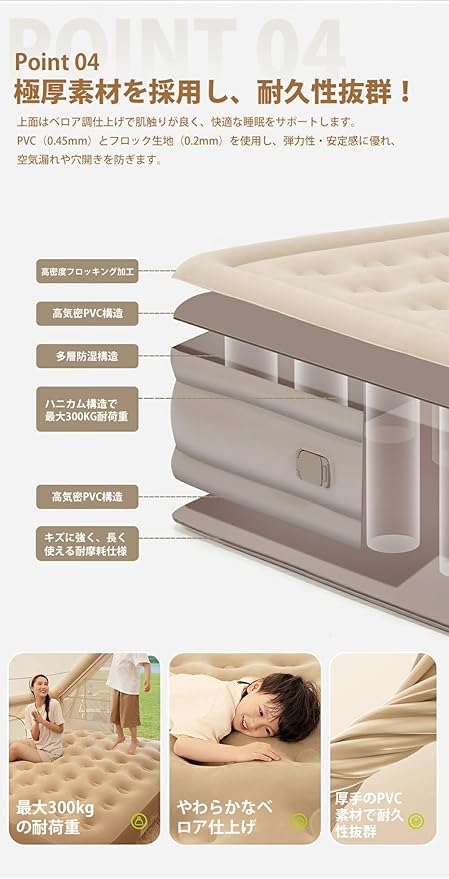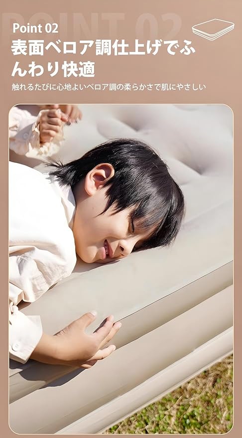 【柔らかい肌触り】表面にはやわらかいベロア生地を使用し、肌に優しく心地よい肌ざわりが感じられます。ソフトフロックの表面加工とベッド内部の空気室でちょうど良い柔らかさを実現し、環境に優しいPVC生地で作られています。保温性・防湿性に優れた材質で、1年を通して使用できます。