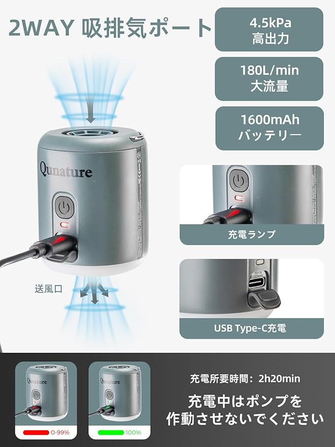 【Type-C/USB充電式&大容量バッテリー】エアポンプはType-Cポート(防水防塵カバー付き)採用で、スマホ充電器/モバイルバッテリー/車載充電器など様々な充電方法に対応。1600mAhの大容量バッテリーを搭載し、満充電で当店のエアマット約25回またはエア枕251回分充填可能。