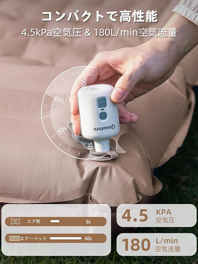 【3in1多機能電動ポンプ】充気・排気・照明がこれ1台で実現!パワフルな空気圧4.5kPa・空気流量180L/minで、たった約60秒でエアーマットの充填が可能です!従来品より充気時間を約70%短縮し、手作業の負担を軽減! さらに、3段階調光LEDライト(低・中・高)を搭載。キャンプ設営時の暗がりはもちろん、災害時の緊急照明としても活躍する優れものです。