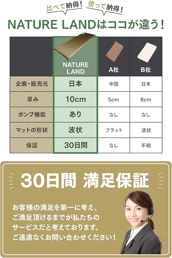 ✅【保証内容・商品詳細】当商品は日本国内にて厳正な検品を行っておりますが、万が一不良等ございましたら弊社までご連絡ください。 〇ブランド:NATURE LAND 〇展開サイズ:190 60 10cm(ウレタンフォーム),収納サイズ:60 25 25cm,重量:約3.4kg 〇素材:(外生地)75Dポリエステル,(内部素材)21Dウレタンフォーム ※ご利用時の注意事項:出荷時に機械で圧縮処理をしているため、初回使用時はウレタン全体に空気が行き渡らず自動で膨らまないor10cmまで膨らまないことがあります。半分くらい空気が入った状態で三つ折りにして上に乗るように空気を抜いて頂くとウレタン全体に空気が馴染みます。同時に収納袋のポンプを使ってマット全体に空気が馴染むようにしてください。ご利用の際は取扱説明書をよくお読みください。〇原産国:中国