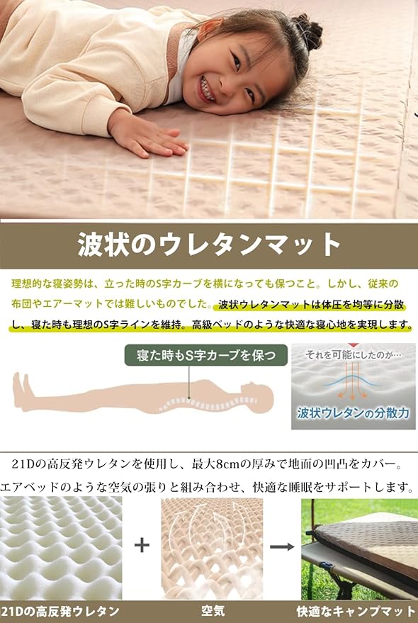️【8cm厚 波形構造で快適性を徹底追求】厚さ8cmの極厚設計で、地面の凹凸や車内の段差も吸収。内部には波形構造のウレタンフォームを採用し、空気層の張りと泡棉のやさしい沈み込みを両立。インフレーターマットならではの体圧分散効果で、寝返りも打ちやすく、ベッドのような寝心地を実現します。底付き感がなく、腰や背中への負担を軽減し、キャンプ 用マットやエアーマットとしてアウトドアで快眠をサポートします。