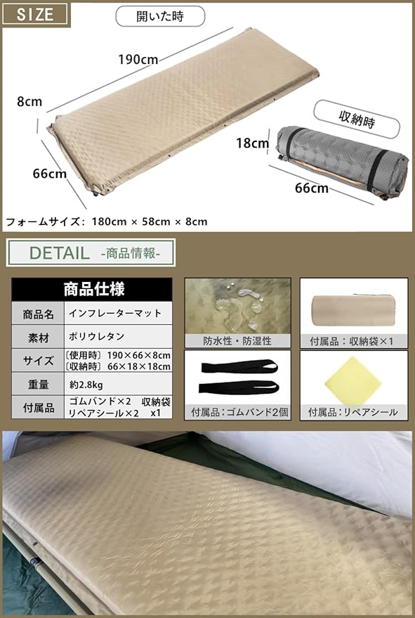 【多用途対応&安心の付属品・保証付き】このエアーマットは、キャンプ・登山・旅行・車中泊・テント泊・ピクニック・災害時など幅広く活躍。公園遊びやイベントの敷物としても便利で、車に常備すれば緊急時にも安心。車中泊マット・自動膨張 キャンプ マット・キャンプ 用マットとしてあらゆるシーンに対応できる汎用性の高さが魅力です。重さは約2.4kgと軽量で女性やお子様でも持ち運び簡単。未使用時は丸めてコンパクト収納。【展開サイズ】190 66 8cm|【フォームサイズ】180 58 8cm【セット内容】自動膨張 キャンプ マット本体、収納バンド 2、収納袋、補修用シール 2、取扱説明書。さらに360日間のメーカー保証付きで、インフレーターマットとして末永くご愛用いただけます。