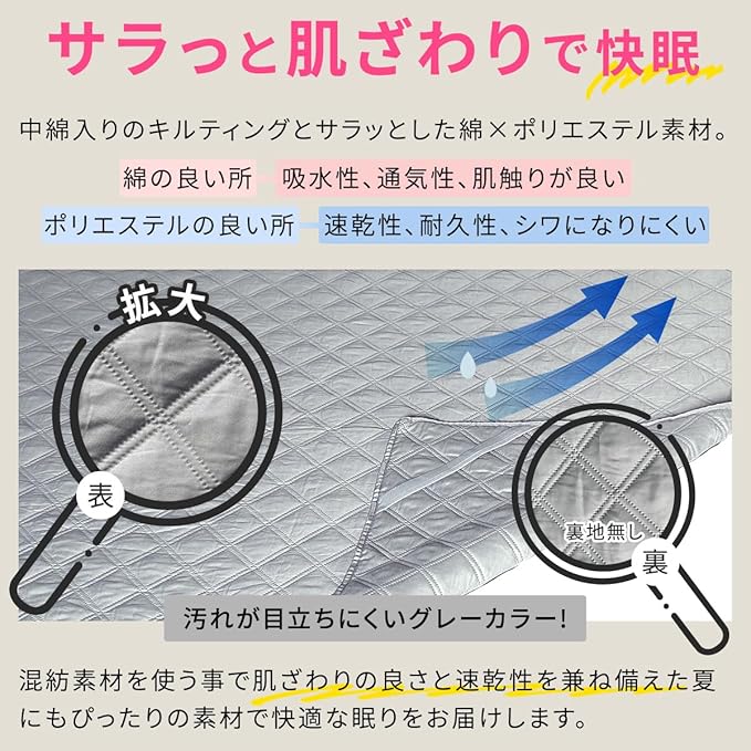 表地は丈夫で肌触りの良いポリエステル素材、裏地には車内やテントでのずれを防止するドット加工を施しました。