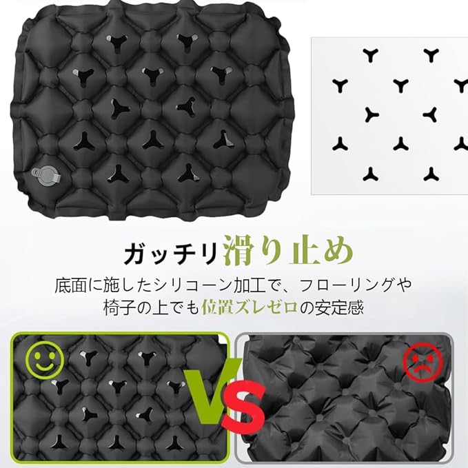 【1~2吹きで瞬時膨らむ快適性】新設計の大口径エアバルブを採用。たった1~2回吹き込むだけで、高さ最大5cmまで調節可能。子どもから大人まで簡単セットでき、長時間の座り心地をしっかりサポート。
