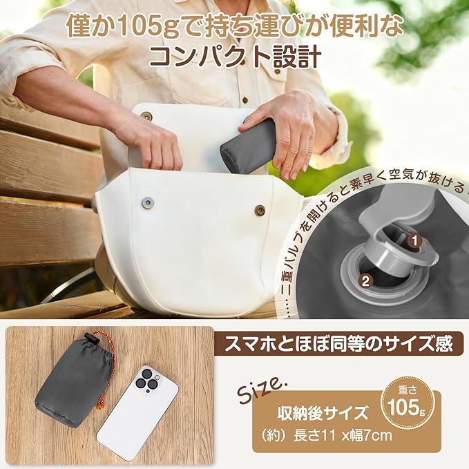 【超軽量&コンパクトに収納可能】収納袋が付属されているDTOETKDクッションは、よりスマートに携帯できます。使わない時は二重バルプの蓋を開けると素早く空気が抜けるので簡単に収納できます。収納後サイズ(11cm*7cm&手のひらサイズ)、重さはわずか105g、バックパックの隙間にも楽々収まり、場所を取りません。アウトドアや旅行に欠かせません!