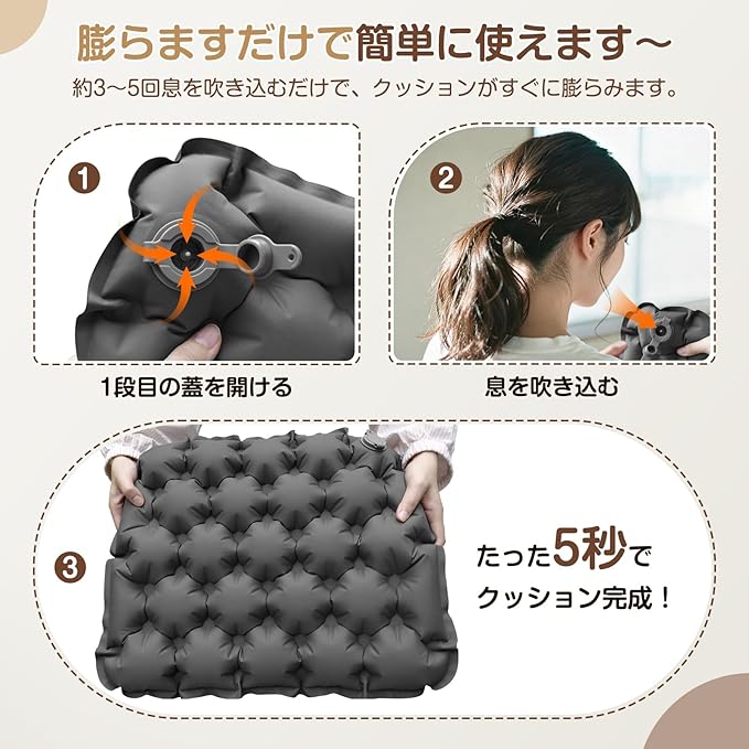【約3~5吹きでセット完了】DTOETKDエアクッションは改良された空気入れ口を採用し、空気を入れる速度が以前より速い。1段目の蓋を開けて、3~5回息を吹き込むだけで、すぐに膨らみます。操作が簡単で、子供やお年寄りでもキャンプやアウトドアなどで簡単に使えるエアークッション。(※膨らみが足りないと感じた場合は、ご自身で調整してください。)