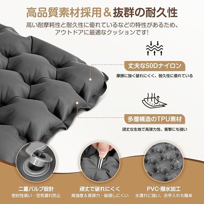 【高品質素材で耐久性抜群】DTOETKD おしりクッションは50Dのナイロンと多層構造のTPU素材を採用、超軽量なのに、最大120kg耐重量、高弾力と耐消耗性が強く、耐久性に優れているなどの特性を持っているため、アウトドアに最もおすすめのエアークッションです。水や汚れにも強い、汚れた場合は濡れタオルで簡単に拭き取ることができます。