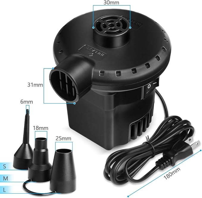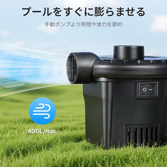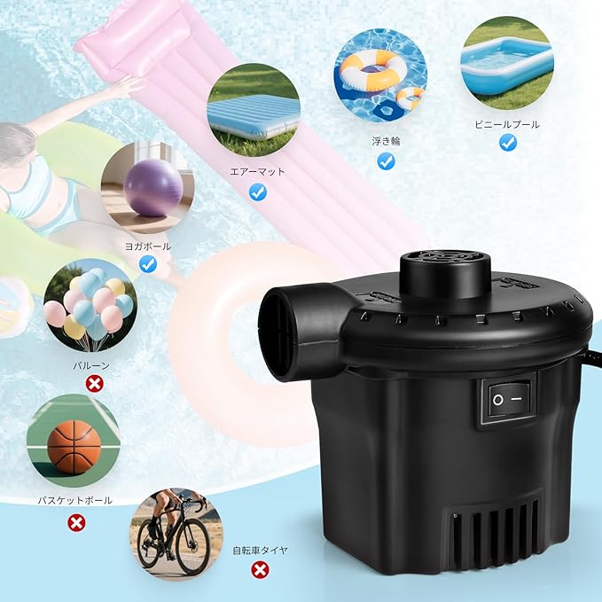 【高実用性】浮き輪、ゴムボート、エアベット、ビニールプールなどなどに適用します。また、布団や衣替えの真空収納にもお役に立ちます。内部には排熱ファンがあり、過熱による危険を防ぎます。※ご注意:風船、バスケットボールや自転車には適用されません。